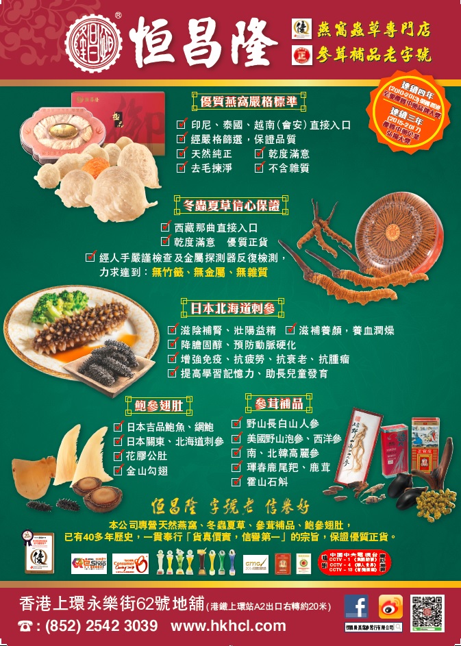 Hang Cheong Loong Bird's Nest & Ginseng Ltd. is a Chinese medicine wholesaler and retailer. It has been set up more than four decades, and the practice on selling genuine products with a reasonable price has been built as a good custom, which wins a good reputation. The company provides great variety of health food, including cordyceps, ginseng, bird(swallow)'s nest, pearl, dried seafood. Meanwhile, we have a comprehensive selling network, which involves various Asian and foreign countries. In addition, we provide Chinese herbalist service for customers, and the "H.C.L. Health Care Product Series" is well-known also. All the series products are referred to the theories of the Chinese medical ancient books, which based on the Chinese custom rule: "Evaluate on the old principle, Gain from various sources", and they are manufactured through a long time clinical research.